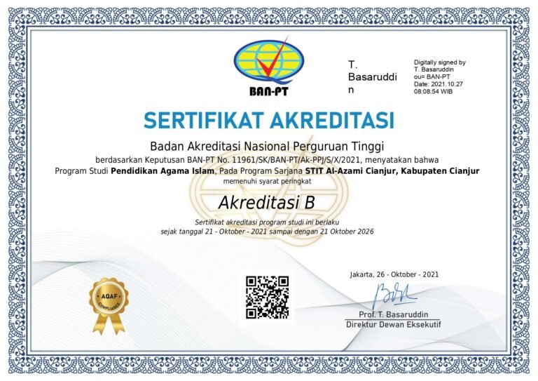 Status Akreditasi Program Studi Pendidikan Agama Islam (PAI) Peringkat Akreditasi Terbaru Teks Penegas: Program Studi PAI saat ini telah terakreditasi dengan peringkat [PERINGKAT AKREDITASI TERAKHIR] berdasarkan Keputusan [BAN-PT / LAMDIK]. Riwayat Akreditasi dan Detail Legalitas PERINGKAT AKREDITASINO. SK / TAHUNMASA BERLAKULEMBAGA AKREDITASI (BAN-PT/LAMDIK)TAUTAN